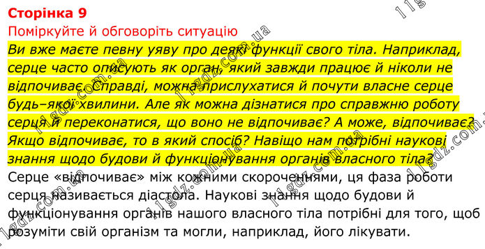 Поміркуйте й обговоріть ситуацію Ви вже маєте певну уяву про деякі функції свого тіла. Наприклад, серце часто описують як орган, який завжди працює й ніколи не відпочиває. Справді, можна прислухатися й почути власне серце будь–якої хвилини. Але як можна дізнатися про справжню роботу серця й переконатися, що воно не відпочиває? А може, відпочиває? Якщо відпочиває, то в який спосіб? Навіщо нам потрібні наукові знання щодо будови й функціонування органів власного тіла? Серце «відпочиває» між кожними скороченнями, ця фаза роботи серця називається діастола. Наукові знання щодо будови й функціонування органів нашого власного тіла потрібні для того, щоб розуміти свій організм та могли, наприклад, його лікувати.