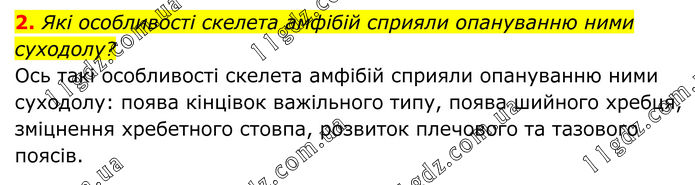 2. Які особливості скелета амфібій сприяли опануванню ними суходолу? Ось такі особливості скелета амфібій сприяли опануванню ними суходолу: поява кінцівок важільного типу, поява шийного хребця, зміцнення хребетного стовпа, розвиток плечового та тазового поясів.