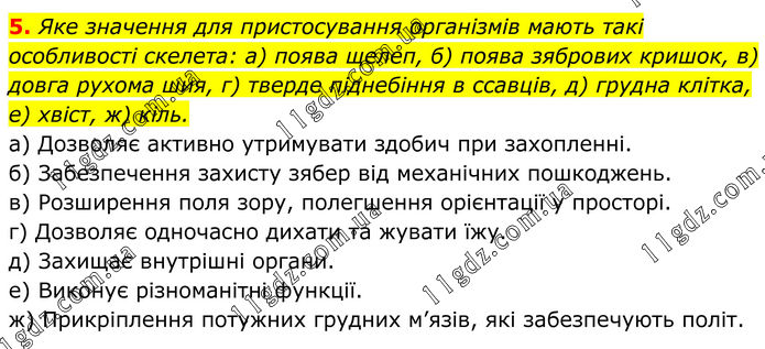 Яке значення для пристосування організмів мають такі особливості скелета: а) поява щелеп, б) поява зябрових кришок, в) довга рухома шия, г) тверде піднебіння в ссавців, д) грудна клітка, е) хвіст, ж) кіль. а) Дозволяє активно утримувати здобич при захопленні. б) Забезпечення захисту зябер від механічних пошкоджень. в) Розширення поля зору, полегшення орієнтації у просторі. г) Дозволяє одночасно дихати та жувати їжу. д) Захищає внутрішні органи. е) Виконує різноманітні функції. ж) Прикріплення потужних грудних м’язів, які забезпечують політ.