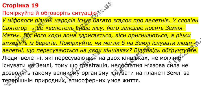 Поміркуйте й обговоріть ситуацію У міфологи різних народів існує багато згадок про велетнів. У слов'ян Святогор — це «велетень вище лісу, його заледве носить Земля–Мати». Від його ходи вона здригається, ліси пригинаються, а річки виходять із берегів. Поміркуйте, чи могли б на Землі існувати люди–велетні, що пересуваються на двох кінцівках? Відповідь обґрунтуйте. Люди–велетні, які пересуваються на двох кінцівках, не могли б існувати на Землі, тому що гравітація, недостатня м’язова сила не дозволять такому великому організму існувати на планеті Землі за теперішнім природних, атмосферних умов життя.