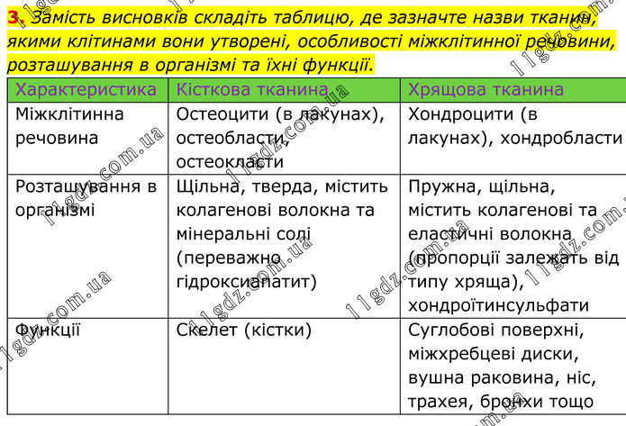 3. Замість висновків складіть таблицю, де зазначте назви тканин, якими клітинами вони утворені, особливості міжклітинної речовини, розташування в організмі та їхні функції. Характеристика Кісткова тканина Хрящова тканина Міжклітинна речовина Остеоцити (в лакунах), остеобласти, остеокласти Хондроцити (в лакунах), хондробласти Розташування в організмі Щільна, тверда, містить колагенові волокна та мінеральні солі (переважно гідроксиапатит) Пружна, щільна, містить колагенові та еластичні волокна (пропорції залежать від типу хряща), хондроїтинсульфати Функції Скелет (кістки) Суглобові поверхні, міжхребцеві диски, вушна раковина, ніс, трахея, бронхи тощо