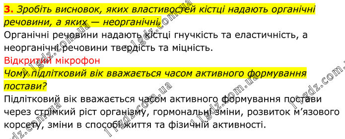 Зробіть висновок, яких властивостей кістці надають органічні речовини, а яких — неорганічні. Органічні речовини надають кістці гнучкість та еластичність, а неорганічні речовини твердість та міцність. Відкритий мікрофон Чому підлітковий вік вважається часом активного формування постави? Підлітковий вік вважається часом активного формування постави через стрімкий ріст організму, гормональні зміни, розвиток м’язового корсету, зміни в способі життя та фізичній активності.