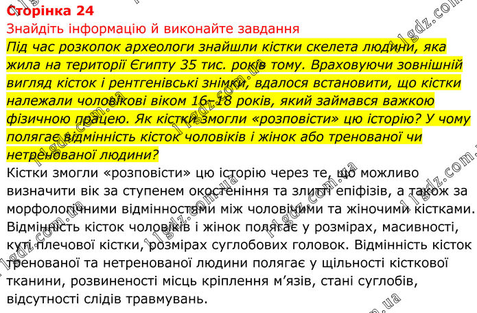 Знайдіть інформацію й виконайте завдання Під час розкопок археологи знайшли кістки скелета людини, яка жила на території Єгипту 35 тис. років тому. Враховуючи зовнішній вигляд кісток і рентгенівські знімки, вдалося встановити, що кістки належали чоловікові віком 16–18 років, який займався важкою фізичною працею. Як кістки змогли «розповісти» цю історію? У чому полягає відмінність кісток чоловіків і жінок або тренованої чи нетренованої людини? Кістки змогли «розповісти» цю історію через те, що можливо визначити вік за ступенем окостеніння та злитті епіфізів, а також за морфологічними відмінностями між чоловічими та жіночими кістками. Відмінність кісток чоловіків і жінок полягає у розмірах, масивності, куті плечової кістки, розмірах суглобових головок. Відмінність кісток тренованої та нетренованої людини полягає у щільності кісткової тканини, розвиненості місць кріплення м’язів, стані суглобів, відсутності слідів травмувань.