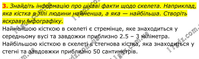 3. Знайдіть інформацію про цікаві факти щодо скелета. Наприклад, яка кістка в тілі людини найменша, а яка — найбільша. Створіть яскраву інфографіку. Найменшою кісткою в скелеті є стремінце, яке знаходиться у середньому вусі та завдожки приблизно 2.5 – 3 міліметра. Найбільшою кісткою в скелеті є стегнова кістка, яка знаходиться у стегні та завдовжки приблизно 50 сантиметрів.