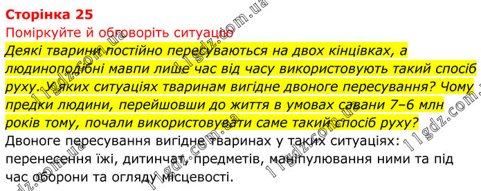 Поміркуйте й обговоріть ситуацію Деякі тварини постійно пересуваються на двох кінцівках, а людиноподібні мавпи лише час від часу використовують такий спосіб руху. У яких ситуаціях тваринам вигідне двоноге пересування? Чому предки людини, перейшовши до життя в умовах савани 7–6 млн років тому, почали використовувати саме такий спосіб руху? Двоноге пересування вигідне тваринах у таких ситуаціях: перенесення їжі, дитинчат, предметів, маніпулювання ними та під час оборони та огляду місцевості.