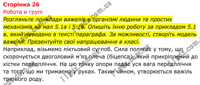 Робота в групі Розгляньте приклади важелів в організмі людини та простих механізмів на мал 5.1а і 5.16. Опишіть їхню роботу за прикладом 5.1 в, який наведено в тексті параграфа. За можливості, створіть модель важеля. Презентуйте свої напрацювання в класі. Наприклад, візьмемо ліктьовий суглоб. Сила полягає у тому, що скорочується двоголовий м’яз плеча (біцепса), який прикріплений до кістки передпліччя. На цю точку опори падає уся вага передпліччя та того, що ми тримаємо у руках. Таким чином, утворюється важіль третього роду.