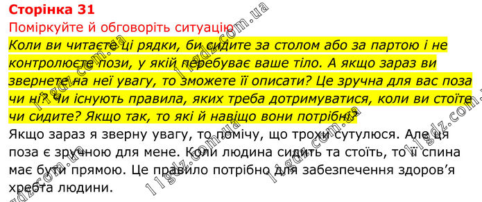 Поміркуйте й обговоріть ситуацію Коли ви читаєте ці рядки, би сидите за столом або за партою і не контролюєте пози, у якій перебуває ваше тіло. А якщо зараз ви звернете на неї увагу, то зможете її описати? Це зручна для вас поза чи ні? Чи існують правила, яких треба дотримуватися, коли ви стоїте чи сидите? Якщо так, то які й навіщо вони потрібні? Якщо зараз я зверну увагу, то помічу, що трохи сутулюся. Але ця поза є зручною для мене. Коли людина сидить та стоїть, то її спина має бути прямою. Це правило потрібно для забезпечення здоров’я хребта людини.