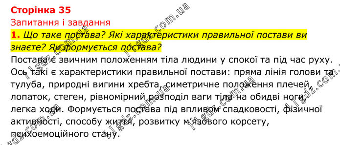 Запитання і завдання 1. Що таке постава? Які характеристики правильної постави ви знаєте? Як формується постава? Постава є звичним положенням тіла людини у спокої та під час руху. Ось такі є характеристики правильної постави: пряма лінія голови та тулуба, природні вигини хребта, симетричне положення плечей, лопаток, стеген, рівномірний розподіл ваги тіла на обидві ноги, легка ходи. Формується постава під впливом спадковості, фізичної активності, способу життя, розвитку м’язового корсету, психоемоційного стану.