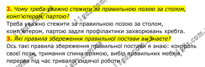 2. Чому треба уважно стежити за правильною позою за столом, комп’ютером, партою? Треба уважно стежити за правильною позою за столом, комп’ютером, партою задля профілактики захворювань хребта. 3. Які правила збереження правильної постави ви знаєте? Ось такі правила збереження правильної постави я знаю: контроль своєї пози, тримання спини прямою, вибір правильних меблів, перерва під час тривалої сидячої роботи.