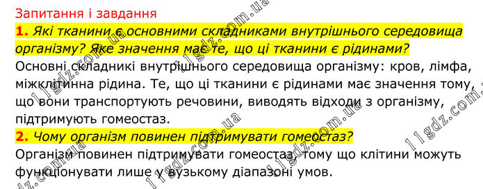 Запитання і завдання 1. Які тканини є основними складниками внутрішнього середовища організму? Яке значення має те, що ці тканини є рідинами? Основні складникі внутрішнього середовища організму: кров, лімфа, міжклітинна рідина. Те, що ці тканини є рідинами має значення тому, що вони транспортують речовини, виводять відходи з організму, підтримують гомеостаз. 2. Чому організм повинен підтримувати гомеостаз? Організм повинен підтримувати гомеостаз, тому що клітини можуть функціонувати лише у вузькому діапазоні умов.