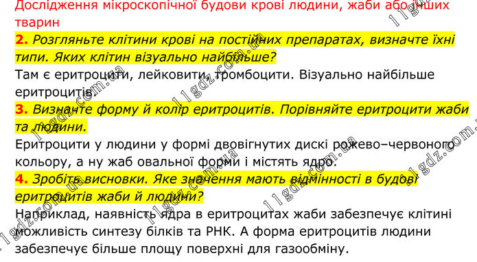 Дослідження мікроскопічної будови крові людини, жаби або інших тварин 2. Розгляньте клітини крові на постійних препаратах, визначте їхні типи. Яких клітин візуально найбільше? Там є еритроцити, лейковити, тромбоцити. Візуально найбільше еритроцитів. 3. Визначте форму й колір еритроцитів. Порівняйте еритроцити жаби та людини. Еритроцити у людини у формі двовігнутих дискі рожево–червоного кольору, а ну жаб овальної форми і містять ядро. 4. Зробіть висновки. Яке значення мають відмінності в будові еритроцитів жаби й людини? Наприклад, наявність ядра в еритроцитах жаби забезпечує клітині можливість синтезу білків та РНК. А форма еритроцитів людини забезпечує більше площу поверхні для газообміну.