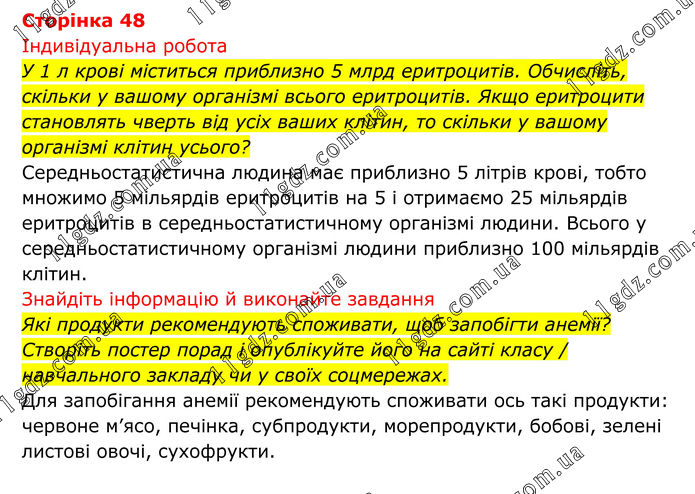 Індивідуальна робота У 1 л крові міститься приблизно 5 млрд еритроцитів. Обчисліть, скільки у вашому організмі всього еритроцитів. Якщо еритроцити становлять чверть від усіх ваших клітин, то скільки у вашому організмі клітин усього? Середньостатистична людина має приблизно 5 літрів крові, тобто множимо 5 мільярдів еритроцитів на 5 і отримаємо 25 мільярдів еритроцитів в середньостатистичному організмі людини. Всього у середньостатистичному організмі людини приблизно 100 мільярдів клітин. Знайдіть інформацію й виконайте завдання Які продукти рекомендують споживати, щоб запобігти анемії? Створіть постер порад і опублікуйте його на сайті класу / навчального закладу чи у своїх соцмережах. Для запобігання анемії рекомендують споживати ось такі продукти: червоне м’ясо, печінка, субпродукти, морепродукти, бобові, зелені листові овочі, сухофрукти.