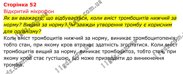 Відкритий мікрофон Як ви вважаєте, що відбувається, коли вміст тромбоцитів нижчий за норму? Вищий за норму? Чи завжди утворення тромбу є корисним для організму? Коли вміст тромбоцитів нижчий за норму, виникає тромбоцитопенія, тобто стан, при якому кров втрачає здатність згортатися. Коли вміст тромбоцитів вищий за норму, виникає тромбоцитоз, тобто стан, при якому кров стає густішою, що може призводити до виникнення тромбів.