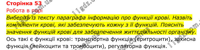 Робота в парі Виберіть із тексту параграфа інформацію про функції крові. Назвіть компоненти крові, які забезпечують кожну з її функцій. Поясніть значення функцій крові для забезпечення життєдіяльності організму. Ось такі є функції крові: транспортна функція (еритроцити), захисна функція (лейкоцити та тромбоцити), регуляторна функція.