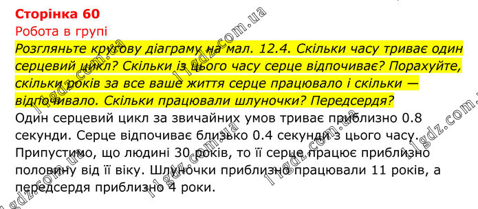 Робота в групі Розгляньте кругову діаграму на мал. 12.4. Скільки часу триває один серцевий цикл? Скільки із цього часу серце відпочиває? Порахуйте, скільки років за все ваше життя серце працювало і скільки — відпочивало. Скільки працювали шлуночки? Передсердя? Один серцевий цикл за звичайних умов триває приблизно 0.8 секунди. Серце відпочиває близько 0.4 секунди з цього часу. Припустимо, що людині 30 років, то її серце працює приблизно половину від її віку. Шлуночки приблизно працювали 11 років, а передсердя приблизно 4 роки.