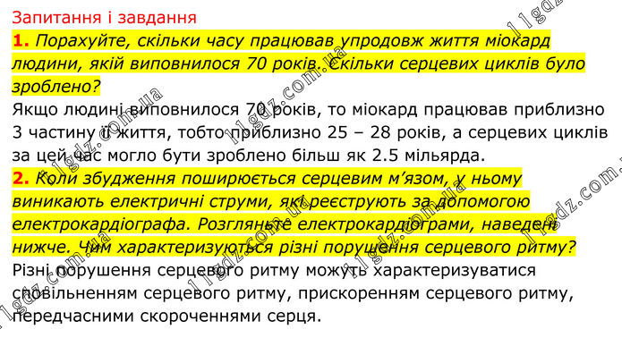 Запитання і завдання 1. Порахуйте, скільки часу працював упродовж життя міокард людини, якій виповнилося 70 років. Скільки серцевих циклів було зроблено? Якщо людині виповнилося 70 років, то міокард працював приблизно 3 частину її життя, тобто приблизно 25 – 28 років, а серцевих циклів за цей час могло бути зроблено більш як 2.5 мільярда. 2. Коли збудження поширюється серцевим м’язом, у ньому виникають електричні струми, які реєструють за допомогою електрокардіографа. Розгляньте електрокардіограми, наведені нижче. Чим характеризуються різні порушення серцевого ритму? Різні порушення серцевого ритму можуть характеризуватися сповільненням серцевого ритму, прискоренням серцевого ритму, передчасними скороченнями серця.