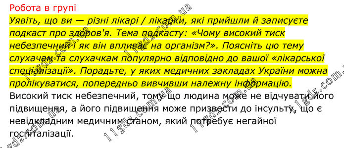 Робота в групі Уявіть, що ви — різні лікарі / лікарки, які прийшли й записуєте подкаст про здоров'я. Тема подкасту: «Чому високий тиск небезпечний і як він впливає на організм?». Поясніть цю тему слухачам та слухачкам популярно відповідно до вашої «лікарської спеціалізації». Порадьте, у яких медичних закладах України можна пролікуватися, попередньо вивчивши належну інформацію. Високий тиск небезпечний, тому що людина може не відчувати його підвищення, а його підвищення може призвести до інсульту, що є невідкладним медичним станом, який потребує негайної госпіталізації.