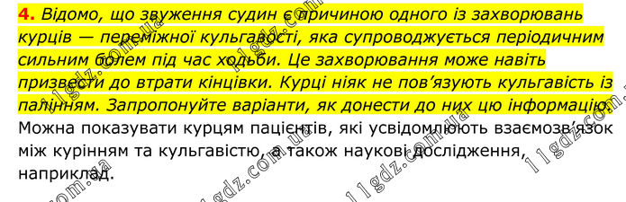 4. Відомо, що звуження судин є причиною одного із захворювань курців — переміжної кульгавості, яка супроводжується періодичним сильним болем під час ходьби. Це захворювання може навіть призвести до втрати кінцівки. Курці ніяк не пов’язують кульгавість із палінням. Запропонуйте варіанти, як донести до них цю інформацію. Можна показувати курцям пацієнтів, які усвідомлюють взаємозв’язок між курінням та кульгавістю, а також наукові дослідження, наприклад.