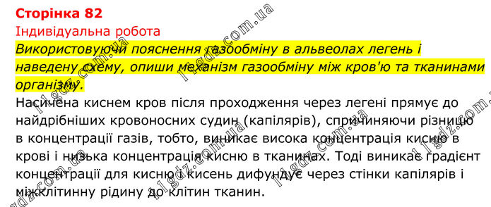 Індивідуальна робота Використовуючи пояснення газообміну в альвеолах легень і наведену схему, опиши механізм газообміну між кров'ю та тканинами організму. Насичена киснем кров після проходження через легені прямує до найдрібніших кровоносних судин (капілярів), спричиняючи різницю в концентрації газів, тобто, виникає висока концентрація кисню в крові і низька концентрація кисню в тканинах. Тоді виникає градієнт концентрації для кисню і кисень дифундує через стінки капілярів і міжклітинну рідину до клітин тканин.