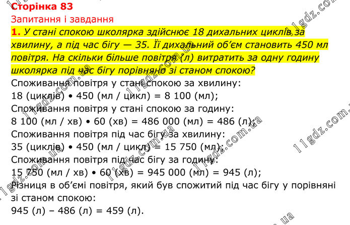 Запитання і завдання 1. У стані спокою школярка здійснює 18 дихальних циклів за хвилину, а під час бігу — 35. Її дихальний об’єм становить 450 мл повітря. На скільки більше повітря (л) витратить за одну годину школярка під час бігу порівняно зі станом спокою? Споживання повітря у стані спокою за хвилину: 18 (циклів) • 450 (мл / цикл) = 8 100 (мл); Споживання повітря у стані спокою за годину: 8 100 (мл / хв) • 60 (хв) = 486 000 (мл) = 486 (л); Споживання повітря під час бігу за хвилину: 35 (циклів) • 450 (мл / цикл) = 15 750 (мл); Споживання повітря під час бігу за годину: 15 750 (мл / хв) • 60 (хв) = 945 000 (мл) = 945 (л); Різниця в об’ємі повітря, який був спожитий під час бігу у порівняні зі станом спокою: 945 (л) – 486 (л) = 459 (л).