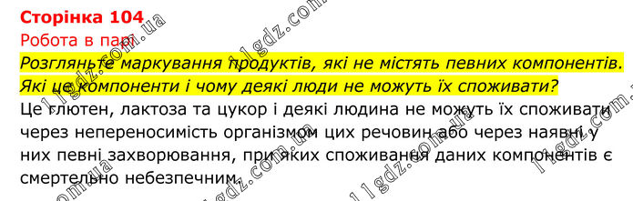 Робота в парі Розгляньте маркування продуктів, які не містять певних компонентів. Які це компоненти і чому деякі люди не можуть їх споживати? Це глютен, лактоза та цукор і деякі людина не можуть їх споживати через непереносимість організмом цих речовин або через наявні у них певні захворювання, при яких споживання даних компонентів є смертельно небезпечним.