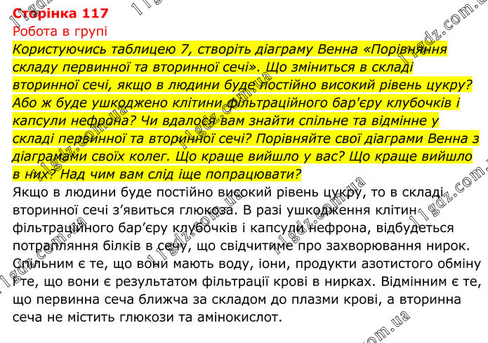 Робота в групі Користуючись таблицею 7, створіть діаграму Венна «Порівняння складу первинної та вторинної сечі». Що зміниться в складі вторинної сечі, якщо в людини буде постійно високий рівень цукру? Або ж буде ушкоджено клітини фільтраційного бар'єру клубочків і капсули нефрона? Чи вдалося вам знайти спільне та відмінне у складі первинної та вторинної сечі? Порівняйте свої діаграми Венна з діаграмами своїх колег. Що краще вийшло у вас? Що краще вийшло в них? Над чим вам слід іще попрацювати? Якщо в людини буде постійно високий рівень цукру, то в складі вторинної сечі з’явиться глюкоза. В разі ушкодження клітин фільтраційного бар’єру клубочків і капсули нефрона, відбудеться потрапляння білків в сечу, що свідчитиме про захворювання нирок. Спільним є те, що вони мають воду, іони, продукти азотистого обміну і те, що вони є результатом фільтрації крові в нирках. Відмінним є те, що первинна сеча ближча за складом до плазми крові, а вторинна сеча не містить глюкози та амінокислот.