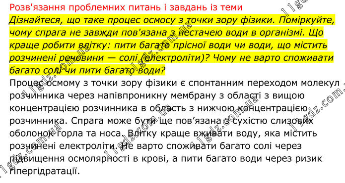 Розв'язання проблемних питань і завдань із теми Дізнайтеся, що таке процес осмосу з точки зору фізики. Поміркуйте, чому спрага не завжди пов'язана з нестачею води в організмі. Що краще робити влітку: пити багато прісної води чи води, що містить розчинені речовини — солі (електроліти)? Чому не варто споживати багато солі чи пити багато води? Процес осмому з точки зору фізики є спонтанним переходом молекул розчинника через напівпроникну мембрану з області з вищою концентрацією розчинника в область з нижчою концентрацією розчинника. Спрага може бути ще пов’язана з сухістю слизових оболонок горла та носа. Влітку краще вживати воду, яка містить розчинені електроліти. Не варто споживати багато солі через підвищення осмолярності в крові, а пити багато води через ризик гіпергідратації.