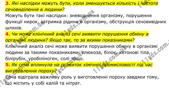 3. Які наслідки можуть бути, коли зменшується кількість і частота сечовиділення в людини? Можуть бути такі наслідки: зневоднення організму, порушення функції нирок, затримка рідини в організму, обструкція сечовивідних шляхів. 4. Чи може клінічний аналіз сечі виявити порушення обміну в організмі людини? Якщо так, то за якими показниками? Клінічний аналіз сечі може виявити порушення обміну в організмі людини за такими показниками: глюкоза, білок, кетонові тіла, білірубін, уробіліноген, солі тощо. 5. Як сеча вплинула на розвиток хімічної промисловості під час виготовлення пороху? Сеча відіграла важливу роль у виготовленні пороху завдяки тому, що містить у собі калій та нітрат.