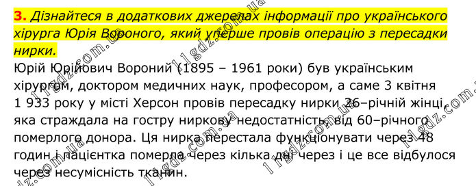 3. Дізнайтеся в додаткових джерелах інформації про українського хірурга Юрія Вороного, який уперше провів операцію з пересадки нирки. Юрій Юрійович Вороний (1895 – 1961 роки) був українським хірургом, доктором медичних наук, професором, а саме 3 квітня 1 933 року у місті Херсон провів пересадку нирки 26–річній жінці, яка страждала на гостру ниркову недостатність, від 60–річного померлого донора. Ця нирка перестала функціонувати через 48 годин і пацієнтка померла через кілька дні через і це все відбулося через несумісність тканин.