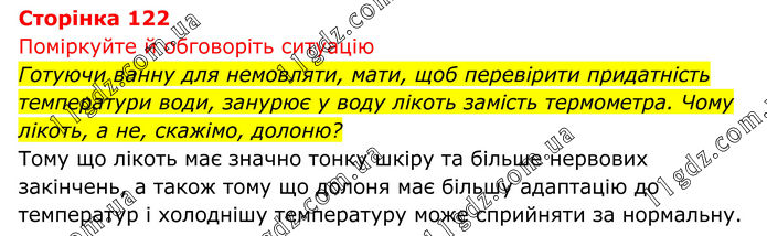 Поміркуйте й обговоріть ситуацію Готуючи ванну для немовляти, мати, щоб перевірити придатність температури води, занурює у воду лікоть замість термометра. Чому лікоть, а не, скажімо, долоню? Тому що лікоть має значно тонку шкіру та більше нервових закінчень, а також тому що долоня має більшу адаптацію до температур і холоднішу температуру може сприйняти за нормальну.