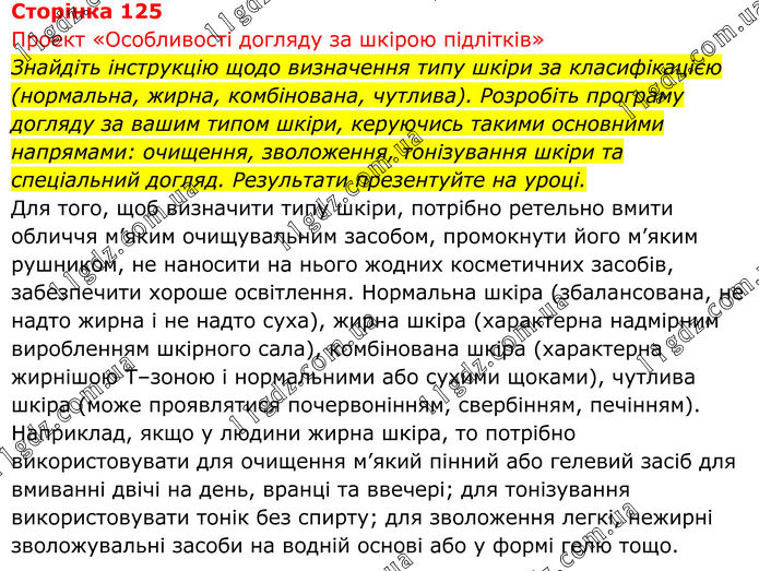 Проект «Особливості догляду за шкірою підлітків» Знайдіть інструкцію щодо визначення типу шкіри за класифікацією (нормальна, жирна, комбінована, чутлива). Розробіть програму догляду за вашим типом шкіри, керуючись такими основними напрямами: очищення, зволоження, тонізування шкіри та спеціальний догляд. Результати презентуйте на уроці. Для того, щоб визначити типу шкіри, потрібно ретельно вмити обличчя м’яким очищувальним засобом, промокнути його м’яким рушником, не наносити на нього жодних косметичних засобів, забезпечити хороше освітлення. Нормальна шкіра (збалансована, не надто жирна і не надто суха), жирна шкіра (характерна надмірним виробленням шкірного сала), комбінована шкіра (характерна жирнішою T–зоною і нормальними або сухими щоками), чутлива шкіра (може проявлятися почервонінням, свербінням, печінням). Наприклад, якщо у людини жирна шкіра, то потрібно використовувати для очищення м’який пінний або гелевий засіб для вмиванні двічі на день, вранці та ввечері; для тонізування використовувати тонік без спирту; для зволоження легкі, нежирні зволожувальні засоби на водній основі або у формі гелю тощо.