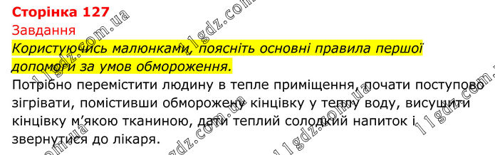 Завдання Користуючись малюнками, поясніть основні правила першої допомоги за умов обмороження. Потрібно перемістити людину в тепле приміщення, почати поступово зігрівати, помістивши обморожену кінцівку у теплу воду, висушити кінцівку м’якою тканиною, дати теплий солодкий напиток і звернутися до лікаря.