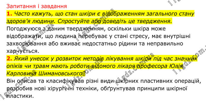 Запитання і завдання 1. Часто кажуть, що стан шкіри є відображенням загального стану здоров’я людини. Спростуйте або доведіть це твердження. Погоджуюся з даним твердженням, оскільки шкіра може відображати, що людина перебуває у стані стресу, має внутрішні захворювання або вживає недостатньо рідини та неправильно харчується. 2. Який унесок у розвиток методів лікування шкіри під час значних опіків чи травм мають роботи відомого лікаря професора Юлія Карловича Шимановського? Він описав та класифікував різні види шкірних пластивних операцій, розробив нові хірургічні техніки, обґрунтував принципи шкірної пластики.