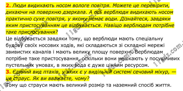 2. Люди видихають носом вологе повітря. Можете це перевірити, дихаючи на поверхню дзеркала. А ось верблюди видихають носом практично сухе повітря, у якому немає води. Дізнайтеся, завдяки яким пристосуванням це відбувається. Навіщо верблюдам потрібне таке пристосування? Це відбувається завдяки тому, що верблюди мають спеціальну будову своїх носових ходів, які складаються зі складної мережі звивистих каналів і мають велику площу поверхні. Верблюдам потрібне таке пристосування, оскільки вони мешкають у посушливих пустельних умовах, в яких вода є дуже цінним ресурсом. 3. Єдиний вид птахів, у яких є у видільній системі сечовий міхур, — це страус. Як ви вважаєте, чому? Тому що страуси мають великий розмір та наземний спосіб життя.