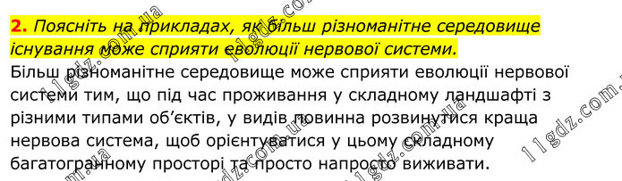 2. Поясніть на прикладах, як більш різноманітне середовище існування може сприяти еволюції нервової системи. Більш різноманітне середовище може сприяти еволюції нервової системи тим, що під час проживання у складному ландшафті з різними типами об’єктів, у видів повинна розвинутися краща нервова система, щоб орієнтуватися у цьому складному багатогранному просторі та просто напросто виживати.