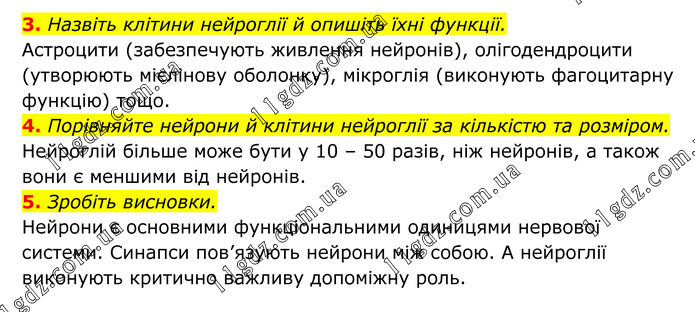 3. Назвіть клітини нейроглії й опишіть їхні функції. Астроцити (забезпечують живлення нейронів), олігодендроцити (утворюють мієлінову оболонку), мікроглія (виконують фагоцитарну функцію) тощо. 4. Порівняйте нейрони й клітини нейроглії за кількістю та розміром. Нейроглій більше може бути у 10 – 50 разів, ніж нейронів, а також вони є меншими від нейронів. 5. Зробіть висновки. Нейрони є основними функціональними одиницями нервової системи. Синапси пов’язують нейрони між собою. А нейроглії виконують критично важливу допоміжну роль.