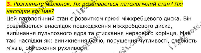 3. Розгляньте малюнок. Як розвивається патологічний стан? Які наслідки він має? Цей патологічний стан є розвитком грижі міжхребцевого диска. Він розвивається внаслідок пошкодження міжхребцевого диска, випинання пульпозного ядра та стискання нервового корінця. Має такі наслідки як: виникнення болю, порушення чутливості, слабкість м’язів, обмеження рухливості.