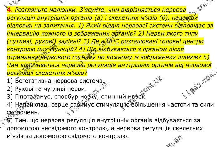4. Розгляньте малюнки. З’ясуйте, чим відрізняється нервова регуляція внутрішніх органів (а) і скелетних м’язів (б), надавши відповіді на запитання. 1) Який відділ нервової системи відповідає за іннервацію кожного із зображених органів? 2) Нерви якого типу (чутливі, рухові) задіяні? 3) Де в ЦНС розташовані головні центри контролю цих функцій? 4) Що відбувається з органом після отримання нервового сигналу по кожному із зображених шляхів? 5) Чим відрізняється нервова регуляція внутрішніх органів від нервової регуляції скелетних м’язів? 1) Вегетативна нервова система. 2) Рухові та чутливі нерви. 3) Гіпоталамус, сповбур мозку, спинний мозок. 4) Наприклад, серце отримує стимуляцію збільшення частоти та сили скорочень. 5) Тим, що нервова регуляція внутрішніх органів відбувається за допомогою несвідомого контролю, а нервова регуляція скелетних м’язів за допомогою свідомого контролю.