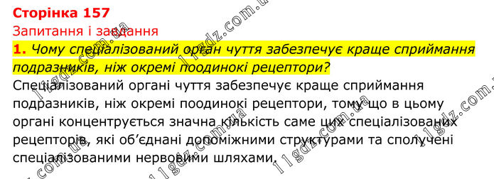 Запитання і завдання 1. Чому спеціалізований орган чуття забезпечує краще сприймання подразників, ніж окремі поодинокі рецептори? Спеціалізований органі чуття забезпечує краще сприймання подразників, ніж окремі поодинокі рецептори, тому що в цьому органі концентрується значна кількість саме цих спеціалізованих рецепторів, які об’єднані допоміжними структурами та сполучені спеціалізованими нервовими шляхами.