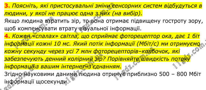 3. Поясніть, які пристосувальні зміни сенсорних систем відбудуться в людини, у якої не працює одна з них (на вибір). Якщо людина втратить зір, то вона отримає підвищену гостроту зору, щоб компенсувати втрату візуальної інформації. 4. Кожен «спалах» світла, що сприймає фоторецептор ока, дає 1 біт інформації кожні 10 мс. Який потік інформації (Мбіт/с) ми отримуємо кожну секунду через усі 7 млн фоторецепторів–колбочок, які забезпечують денний колірний зір? Порівняйте швидкість потоку інформації з вашим інтернет–з’єднанням. Згідно науковими даними людина отримує приблизно 500 – 800 Мбіт інформації щосекунди.