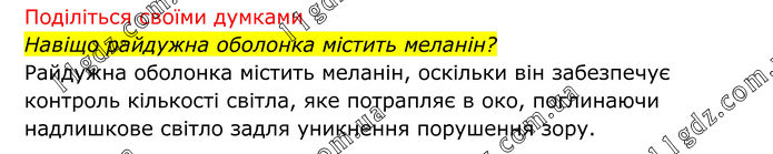 Поділіться своїми думками Навіщо райдужна оболонка містить меланін? Райдужна оболонка містить меланін, оскільки він забезпечує контроль кількості світла, яке потрапляє в око, поглинаючи надлишкове світло задля уникнення порушення зору.