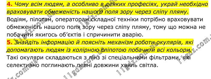 4. Чому всім людям, а особливо в деяких професіях, украй необхідно враховувати обмеженість нашого поля зору через сліпу пляму. Водіям, пілотам, операторам складної техніки потрібно враховувати обмеженість нашого поля зору через сліпу пляму, тому що можна не побачити якигось об’єктів і спричинити аварію. 5. Знайдіть інформацію й поясніть механізм роботи окулярів, які допомагають людям із колірною сліпотою побачити всі кольори. Такі окуляри складаються з лінз зі спеціальними фільтрами, які селективно поглинають певні довжини хвиль світла.