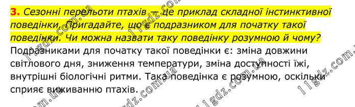 3. Сезонні перельоти птахів — це приклад складної інстинктивної поведінки. Пригадайте, що є подразником для початку такої поведінки. Чи можна назвати таку поведінку розумною й чому? Подразниками для початку такої поведінки є: зміна довжини світлового дня, зниження температури, зміна доступності їжі, внутрішні біологічні ритми. Така поведінка є розумною, оскільки сприяє виживанню птахів.