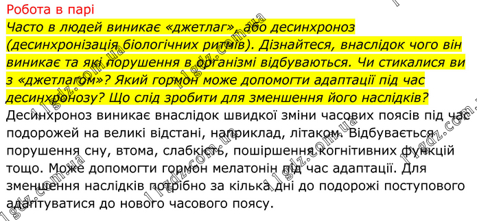 Робота в парі Часто в людей виникає «джетлаг», або десинхроноз (десинхронізація біологічних ритмів). Дізнайтеся, внаслідок чого він виникає та які порушення в організмі відбуваються. Чи стикалися ви з «джетлагом»? Який гормон може допомогти адаптації під час десинхронозу? Що слід зробити для зменшення його наслідків? Десинхроноз виникає внаслідок швидкої зміни часових поясів під час подорожей на великі відстані, наприклад, літаком. Відбувається порушення сну, втома, слабкість, пошіршення когнітивних функцій тощо. Може допомогти гормон мелатонін під час адаптації. Для зменшення наслідків потрібно за кілька дні до подорожі поступового адаптуватися до нового часового поясу.