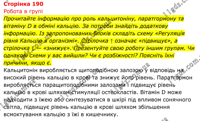 Робота в групі Прочитайте інформацію про роль кальцитоніну, паратгормону та вітаміну D в обміні кальцію. За потреби знайдіть додаткову інформацію. Із запропонованих блоків складіть схему «Регуляція рівня Кальцію в організмі». Стрілочка ↑ означає «підвищує», а стрілочка ↓ — «знижує». Презентуйте свою роботу іншим групам. Чи однакові схеми у вас вийшли? Чи є розбіжності? Поясніть їхні причини, якщо є. Кальцитонін виробляється щитоподібною залозою у відповідь на високий рівень кальцію в крові та знижує його рівень. Паратгормон виробляється паращитоподібними залозами і підвищує рівень кальцію в крові шляхом стимуляції остеокластів. Вітамін D може надходити з їжею або синтезуватися в шкірі під впливом сонячного світла, підвищує рівень кальцію в крові шляхом збільшення всмоктування кальцію з їжі в кишечнику.