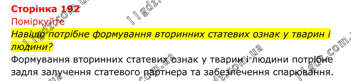 Поміркуйте Навіщо потрібне формування вторинних статевих ознак у тварин і людини? Формування вторинних статевих ознак у тварин і людини потрібне задля залучення статевого партнера та забезпечення спарювання.