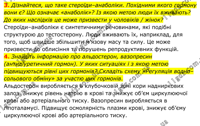 3. Дізнайтеся, що таке стероїди–анаболіки. Похідними якого гормону вони є? Що означає «анаболік»? Із якою метою люди їх вживають? До яких наслідків це може призвести у чоловіків / жінок? Стероїди–анаболіки є синтетичними речовинами, які подібні структурою до тестостерону. Люди вживають їх, наприклад, для того, щоб швидше збільшити м’язову масу та силу. Це може призвести до облисіння та порушень репродуктивних функцій. 4. Знайдіть інформацію про альдостерон, вазопресин (антидіуретичний гормон). У яких ситуаціях і з якою метою підвищуються рівні цих гормонів? Складіть схему «Регуляція водно–сольового обміну» за участю цих гормонів. Альдостерон виробляється в клубочковій зоні кори надниркових залоз. Знижує рівень натрію в крові та знижує об’єм циркулюючої крові або артеріального тиску. Вазопресин виробляється в гіпоталамусі. Підвищує осмолярність плазми крові, знижує об’єму циркулюючої крові або артеріального тиску.