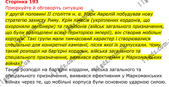 Поміркуйте й обговоріть ситуацію У другій половині II століття н. е. Марк Аврелій побудував нову стратегію захисту Риму. Крім лімесів (укріплених кордонів, що охороняли легіонери) та гарнізонів (військ загального призначення, що були розподілені всією територією імперії), він створив мобільні корпуси. Такі групи мали тимчасовий характер і створювалися спеціально для конкретної кампанії, після якої їх розпускали. Чому такий розподіл на бар'єрні кордони, війська загального та спеціального призначення, виявився ефективним у Маркоманських війнах? Такий розподіл на бар’єрні кордони, війська загального та спеціального призначення, виявився ефективним у Маркоманських війнах через те, що мобільні корпуса були основною ударною силою.