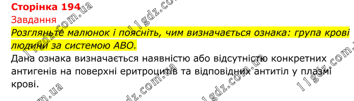 Завдання Розгляньте малюнок і поясніть, чим визначається ознака: група крові людини за системою АВО. Дана ознака визначається наявністю або відсутністю конкретних антигенів на поверхні еритроцитів та відповідних антитіл у плазмі крові.