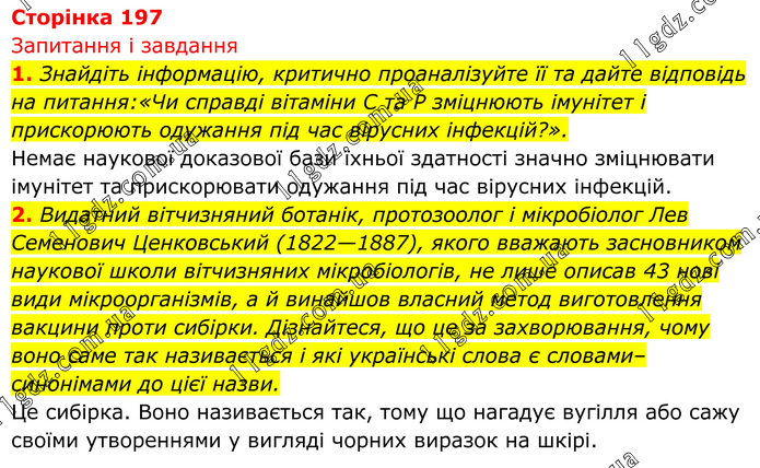 Запитання і завдання 1. Знайдіть інформацію, критично проаналізуйте її та дайте відповідь на питання:«Чи справді вітаміни С та P зміцнюють імунітет і прискорюють одужання під час вірусних інфекцій?». Немає наукової доказової бази їхньої здатності значно зміцнювати імунітет та прискорювати одужання під час вірусних інфекцій. 2. Видатний вітчизняний ботанік, протозоолог і мікробіолог Лев Семенович Ценковський (1822—1887), якого вважають засновником наукової школи вітчизняних мікробіологів, не лише описав 43 нові види мікроорганізмів, а й винайшов власний метод виготовлення вакцини проти сибірки. Дізнайтеся, що це за захворювання, чому воно саме так називається і які українські слова є словами–синонімами до цієї назви. Це сибірка. Воно називається так, тому що нагадує вугілля або сажу своїми утвореннями у вигляді чорних виразок на шкірі.